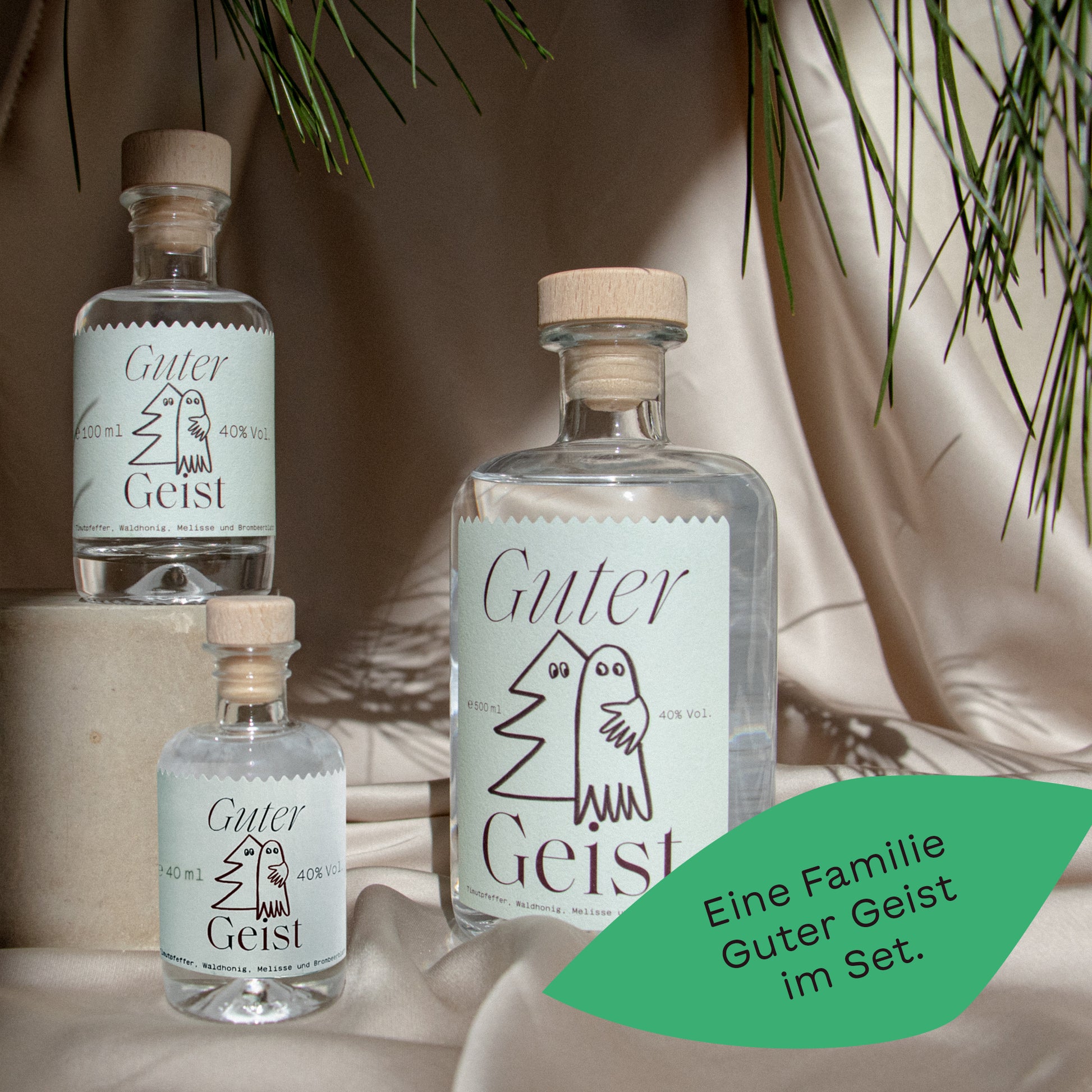 Eine große Flasche Guter Geist (500ml), eine mittlere (100ml) und eine kleine (40ml) im Set.